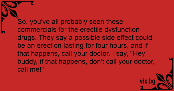 So, you've all probably seen these commercials for the erectile dysfunction drugs. They say a possible side effect could be an еrестiоn lasting for four hours, and if that happens, call your doctor. I say, "Hey buddy, if that happens, don't call your doctor, call me!"