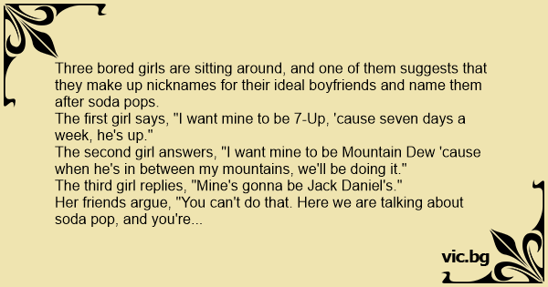 The second girl answers, "I want mine to be Mountain Dew 'cause when he's in between my mountains, we'll be doing it."