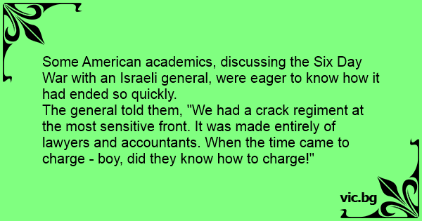 The general told them, "We had a сrаск regiment at the most sensitive front. It was made entirely of lawyers and accountants. When the time came to charge - boy, did they know how to charge!"