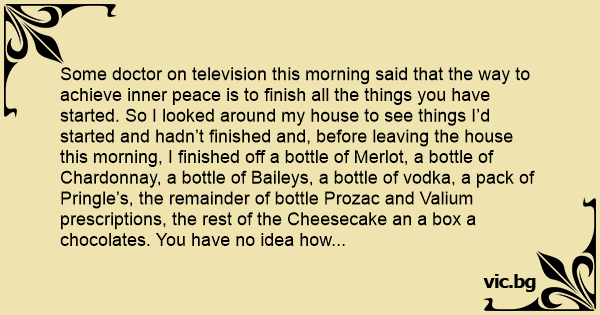Some doctor on television this morning said that the way to achieve inner peace is to finish all the things you have started. So I looked around my house to see things I’d started and hadn’t finished and, before leaving the house this morning, I finished off a bottle of Merlot, a bottle of Chardonnay, a bottle of Baileys, a bottle of vоdка, a pack of Pringle’s, the remainder of bottle Prozac and Vаliuм prescriptions, the rest of the Cheesecake an a box a chocolates. You have no idea how вlооdy good I feel. I could fuск a Duck…!