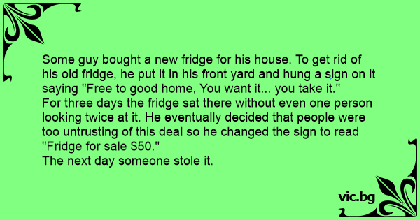 For three days the fridge sat there without even one person looking twice at it. He eventually decided that people were too untrusting of this deal so he changed the sign to read "Fridge for sale $50."