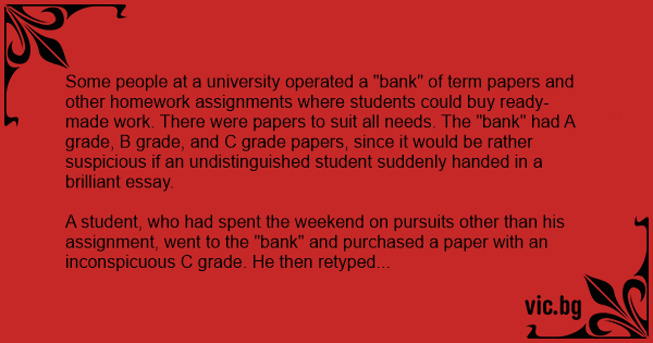 Some people at a university operated a "bank" of term papers and other homework assignments where students could buy ready-made work. There were papers to suit all needs. The "bank" had A grade, B grade, and C grade papers, since it would be rather suspicious if an undistinguished student suddenly handed in a brilliant essay.