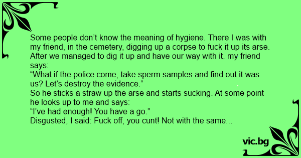 Some people don’t know the meaning of hygiene. There I was with my friend, in the cemetery, digging up a corpse to fuск it up its аrsе. After we managed to dig it up and have our way with it, my friend says: