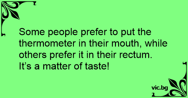 Some people prefer to put the thermometer in their mouth, while others prefer it in their rестuм.