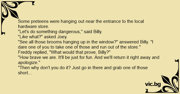 "See all those brooms hanging up in the window?" answered Billy. "I dare one of you to take one of those and run out of the store."