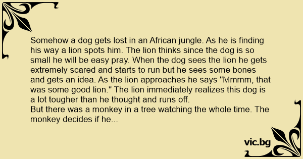 Somehow a dog gets lost in an African jungle. As he is finding his way a lion spots him. The lion thinks since the dog is so small he will be easy pray. When the dog sees the lion he gets extremely scared and starts to run but he sees some bones and gets an idea. As the lion approaches he says "Mmmm, that was some good lion." The lion immediately realizes this dog is a lot tougher than he thought and runs off.
