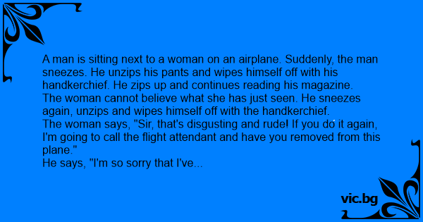 A man is sitting next to a woman on an airplane. Suddenly, the man sneezes. He unzips his pants and wipes himself off with his handkerchief. He zips up and continues reading his magazine.