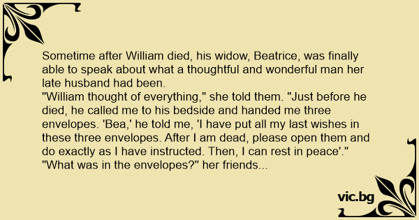 "William thought of everything," she told them. "Just before he died, he called me to his bedside and handed me three envelopes. 'Bea,' he told me, 'I have put all my last wishes in these three envelopes. After I am dead, please open them and do exactly as I have instructed. Then, I can rest in peace'."