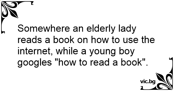 Somewhere an elderly lady reads a book on how to use the internet, while a young boy googles "how to read a book".