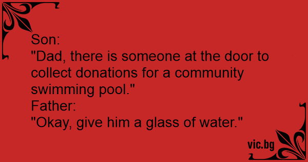 Papá, papá hay un señor en la puerta diciendome que está haciendo una colecta para una pileta de natación. - Está bien hijo, dale un vaso de agua.