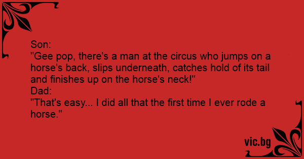 "Gee pop, there's a man at the circus who jumps on a horse's back, slips underneath, catches hold of its tail and finishes up on the horse's neck!"
