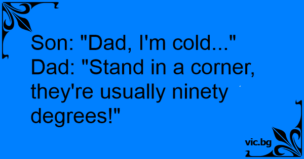 En pappa till sin son: - Fryser du? - Ja. - Gå och sätt dig i ett hörn då. Där är det alltid 90 grader.