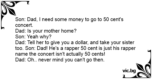 Dad: Tell her to give you a dollar, and take your sister too. Son: Dad! He's a rapper 50 cent is just his rapper name the concert isn't actually 50 cents!