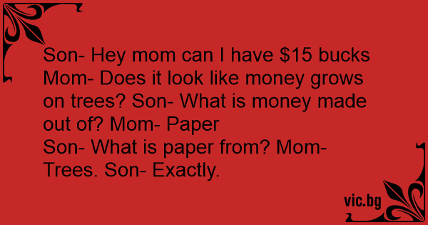 Mom- Does it look like money grows on trees? Son- What is money made out of? Mom- Paper