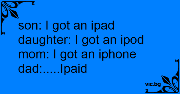 Son: Iphone! * holding it* Daughter: Ipod! *holding it* Mom: Ipad! *holding it* Dad: IPAID!