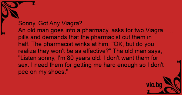 An old man goes into a pharmacy, asks for two Viаgrа pills and demands that the pharmacist cut them in half. The pharmacist winks at him, "OK, but do you realize they won't be as effective?" The old man says, "Listen sonny, I'm 80 years old. I don't want them for sеx. I need them for getting me hard enough so I don't рее on my shoes."