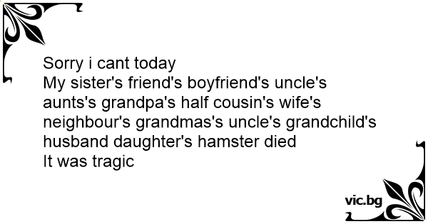 My sister's friend's boyfriend's uncle's aunts's grandpa's half cousin's wife's neighbour's grandmas's uncle's grandchild's husband daughter's hamster died