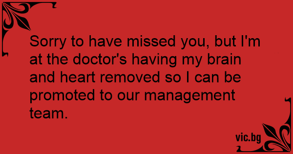 Sorry to have missed you, but I'm at the doctor's having my brain and heart removed so I can be promoted to our management team.