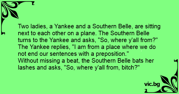 Two ladies, a Yankee and a Southern Belle, are sitting next to each other on a plane. The Southern Belle turns to the Yankee and asks, "So, where y'all from?"