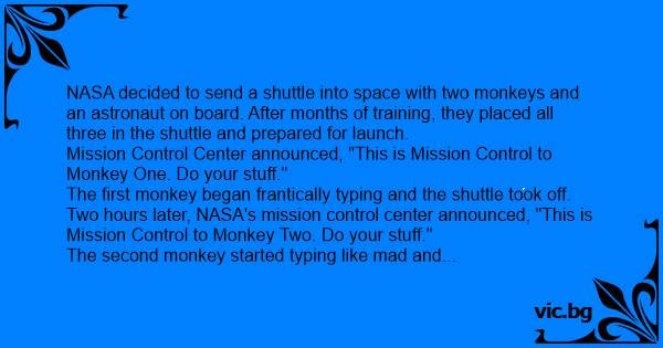NASA decided to send a shuttle into space with two monkeys and an astronaut on board. After months of training, they placed all three in the shuttle and prepared for launch.