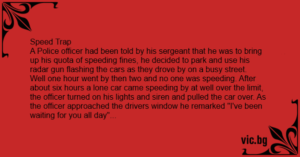 Well one hour went by then two and no one was speeding. After about six hours a lone car came speeding by at well over the limit, the officer turned on his lights and siren and pulled the car over. As the officer approached the drivers window he remarked "I've been waiting for you all day" and the driver replied, "Well I got here as fast as I could"