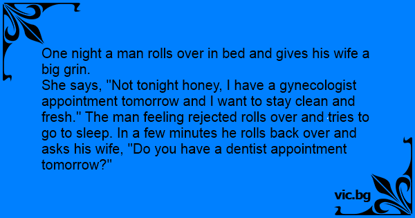 She says, ''Not tonight honey, I have a gynecologist appointment tomorrow and I want to stay clean and fresh.'' The man feeling rejected rolls over and tries to go to sleep. In a few minutes he rolls back over and asks his wife, ''Do you have a dentist appointment tomorrow?''