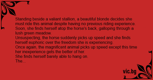 Standing beside a valiant stallion, a beautiful blonde decides she must ride this animal despite having no previous riding experience.