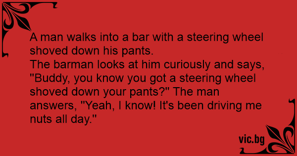 The barman looks at him curiously and says, ''Buddy, you know you got a steering wheel shoved down your pants?'' The man answers, ''Yeah, I know! It's been driving me nuts all day.''