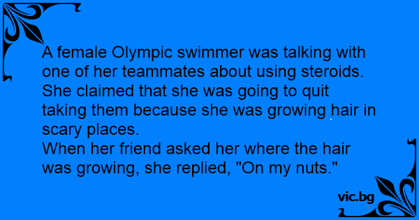 A female Olympic swimmer was talking with one of her teammates about using steroids. She claimed that she was going to quit taking them because she was growing hair in scary places.