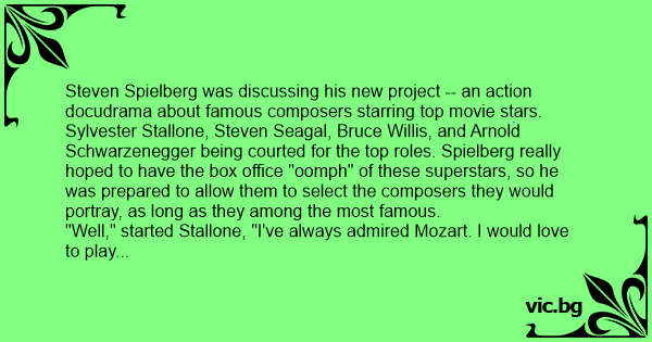 Steven Spielberg was discussing his new project -- an action docudrama about famous composers starring top movie stars. Sylvester Stallone, Steven Seagal, Bruce Willis, and Arnold Schwarzenegger being courted for the top roles. Spielberg really hoped to have the box office "oomph" of these superstars, so he was prepared to allow them to select the composers they would portray, as long as they among the most famous.