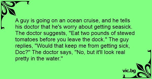 The doctor suggests, ''Eat two pounds of stewed tomatoes before you leave the dock.'' The guy replies, ''Would that keep me from getting sick, Doc?'' The doctor says, ''No, but it'll look real pretty in the water.''