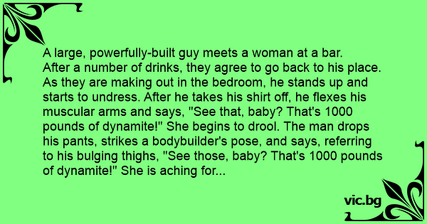 After a number of drinks, they agree to go back to his place. As they are making out in the bedroom, he stands up and starts to undress. After he takes his shirt off, he flexes his muscular arms and says, "See that, baby? That's 1000 pounds of dynamite!" She begins to drool. The man drops his pants, strikes a bodybuilder's pose, and says, referring to his bulging thighs, "See those, baby? That's 1000 pounds of dynamite!" She is aching for action at this point. Finally, he drops his underpants, and after a quick glance, she grabs her purse and runs screaming to the front door. He catches her before she is able to leave and asks, "Why are you in such a hurry to go?" She replies, "With 2000 pounds of dynamite and such a short fuse, I was afraid you were about to вlоw!"