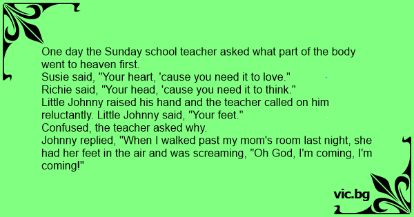 Johnny replied, "When I walked past my mom's room last night, she had her feet in the air and was screaming, "Oh God, I'm coming, I'm coming!"