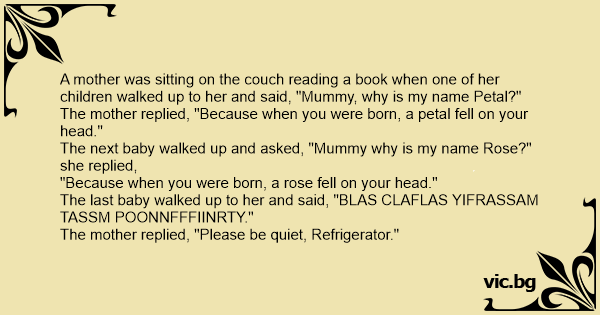 A mother was sitting on the couch reading a book when one of her children walked up to her and said, "Mummy, why is my name Petal?"
