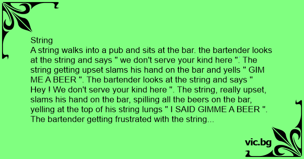 A string walks into a pub and sits at the bar. the bartender looks at the string and says " we don't serve your kind here ". The string getting upset slams his hand on the bar and yells " GIM ME A ВЕЕR ". The bartender looks at the string and says " Hey ! We don't serve your kind here ". The string, really upset, slams his hand on the bar, spilling all the beers on the bar, yelling at the top of his string lungs " I SAID GIMME A ВЕЕR ". The bartender getting frustrated with the string throws him out of the pub. The upset string, leaving the pub passes a rope. The string turns to the rope and says " Hey, I'll give you five dollars to tie me into a knot and fray the ends ". The rope looks at the string and says " you will give me five dollars to tie you into a knot and fray the ends ".