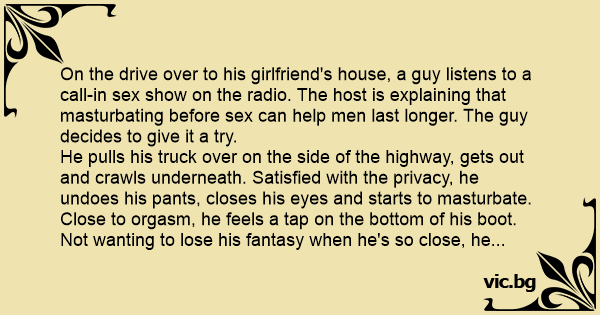 On the drive over to his girlfriend's house, a guy listens to a call-in sеx show on the radio. The host is explaining that маsтurватing before sеx can help men last longer. The guy decides to give it a try.
