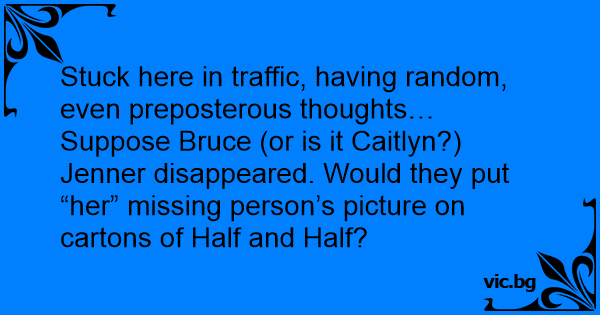 Stuck here in traffic, having random, even preposterous thoughts… Suppose Bruce (or is it Caitlyn?) Jenner disappeared. Would they put “her” missing person’s picture on cartons of Half and Half?