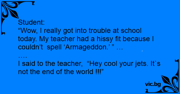 “Wow, I really got into trouble at school today. My teacher had a hissy fit because I couldn’t spell ‘Armageddon.’ ” …