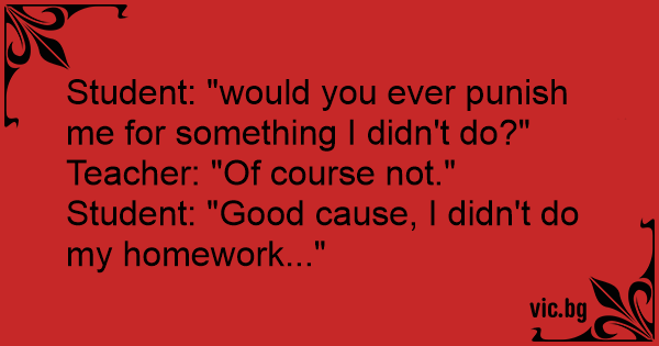 "Kann man für etwas bestraft werden was man gar nicht gemacht hat?", fragt Fritz den Lehrer. Lehrer antwortet: "Nein kann man nicht." Fritz: "Gut, ich hab nämlich meine Hausaufgabe nicht gemacht!"