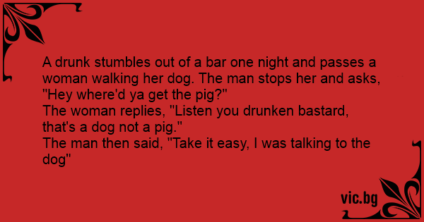 A drunк stumbles out of a bar one night and passes a woman walking her dog. The man stops her and asks, "Hey where'd ya get the pig?"