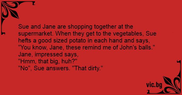 Sue and Jane are shopping together at the supermarket. When they get to the vegetables, Sue hefts a good sized potato in each hand and says,
