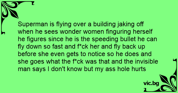 Superman is flying over a building jaking off when he sees wonder women finguring herself he figures since he is the speeding bullet he can fly down so fast and fuск her and fly back up before she even gets to notice so he does and she goes what the fuск was that and the invisible man says I don't know but my аss hole hurts