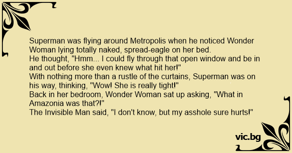 Superman stava sorvolando la terra alla velocità della luce. Improvvisamente vide Wonder Woman che giaceva distesa su una spiaggia deserta, nuda, con le gambe spalancate e la passerina in bella evidenza che trasudava piacere. Colto da tale miraggio decise che non poteva lasciarsi sfuggire...