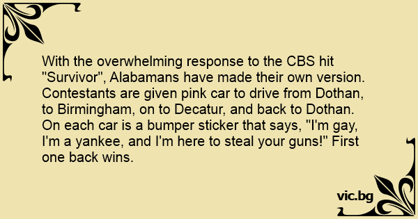 Contestants are given pink car to drive from Dothan, to Birmingham, on to Decatur, and back to Dothan. On each car is a bumper sticker that says, "I'm gаy, I'm a yankee, and I'm here to steal your guns!" First one back wins.
