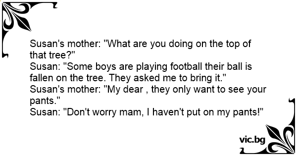 Maria gik glad hjem og fortæller hendes mor om, hvordan hun tjente 100 kr. ved klatring et træ. Hendes mor svarede, “Maria, ville bare se dine trusser!” Hvorefter Maria svarede: “Se mor, jeg var...