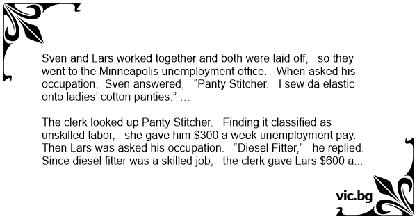 Sven and Lars worked together and both were laid off, so they went to the Minneapolis unemployment office. When asked his occupation, Sven answered, “Раnтy Stitcher. I sew da elastic onto ladies’ cotton раnтiеs.” …