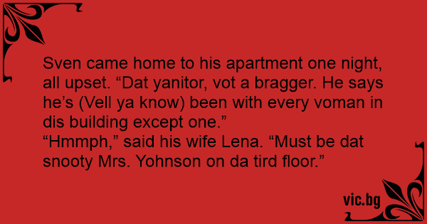 Sven came home to his apartment one night, all upset. “Dat yanitor, vot a bragger. He says he’s (Vell ya know) been with every voman in dis building except one.”