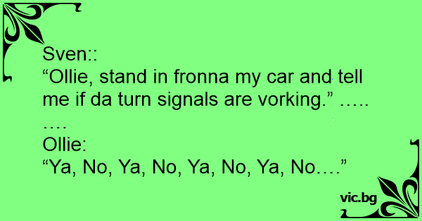 “Ollie, stand in fronna my car and tell me if da turn signals are vorking.” …..