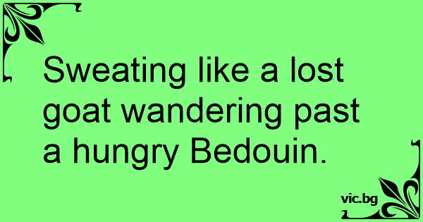 Sweating like a lost goat wandering past a hungry Bedouin.