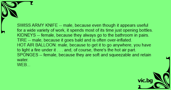 SWISS ARMY KNIFE -- male, because even though it appears useful for a wide variety of work, it spends most of its time just opening bottles.
